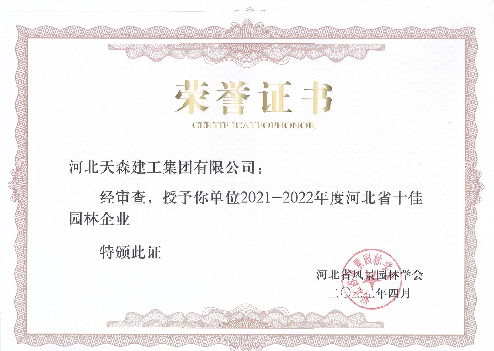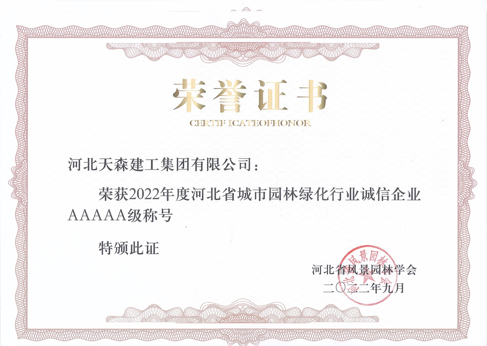 此外公司還榮獲2022年度河北省城市園林綠化行業(yè)誠信企業(yè)AAAAA級稱號、集團公司被授予2021-2022年度河北省十佳園林企業(yè)、集團公司被評定為2021-2022年度河北省園林優(yōu)秀企業(yè)。